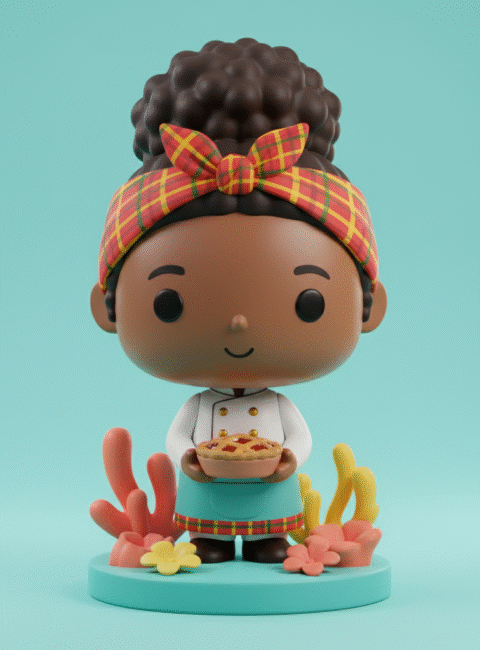 Bébé’s apron is stitched with little hearts, waves, and bright Saintoise colors, carrying the spirit of the islands with her everywhere she goes. Her pastries are as tender as they are flavorful: buttery crusts, gently spiced sponge, and glowing coconut confiture at the center. She believes that every tart holds a piece of island memory, a whisper of old songs, and the comfort of home.