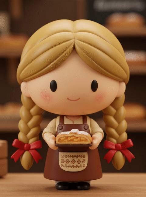 Fräulein Apfelstrudel Liese brings the heartwarming comfort of German home baking into every dessert she makes. Her specialty is apfelstrudel — thin layers of dough wrapped around spiced apples, raisins, and a touch of sweetness. She bakes with calm precision, believing that food tastes better when shaped with patience and care.